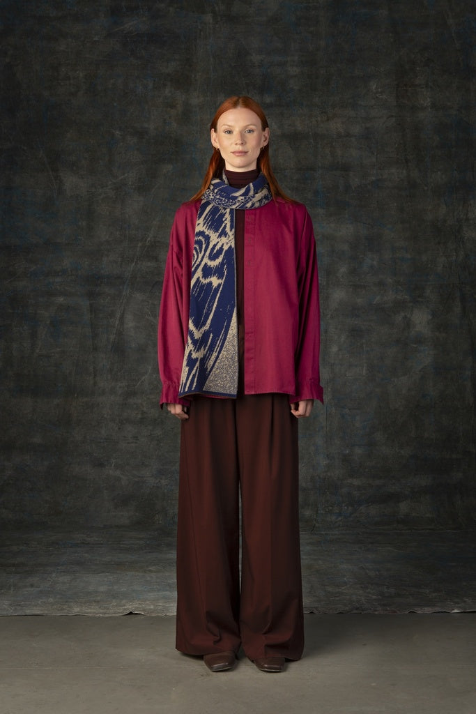 Aurata is an ultra-soft jacquard knitted scarf made of 100% extra-fine merino wool, featuring a moth-inspired design that’s visible on both sides, offering a reversible look.