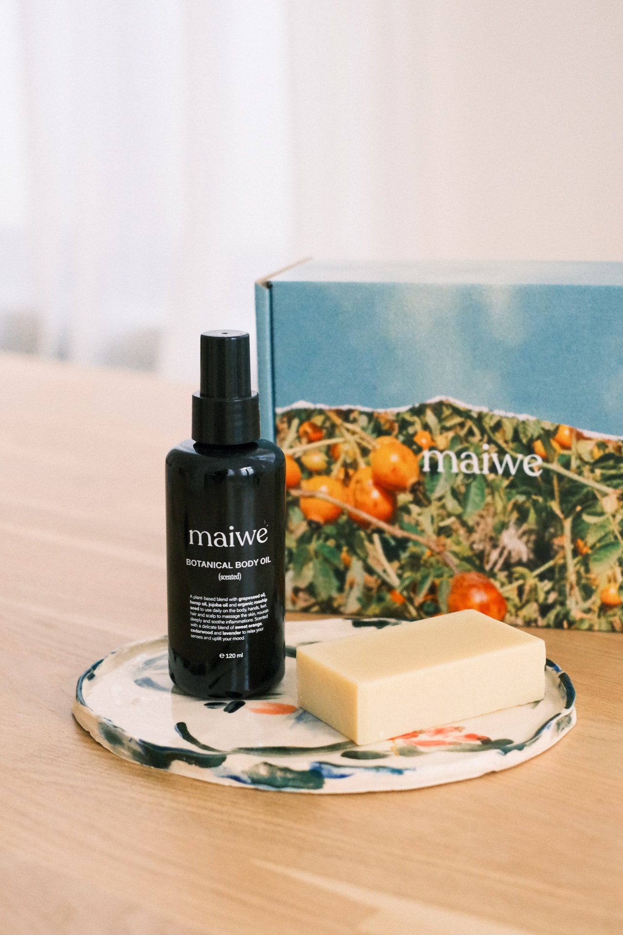 - Botanical Body Oil – A nourishing blend of grapeseed, hemp, and jojoba oils with organic rosehip. Infused with sweet orange, cedarwood, and lavender for a calming, uplifting scent.