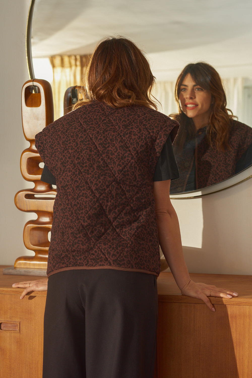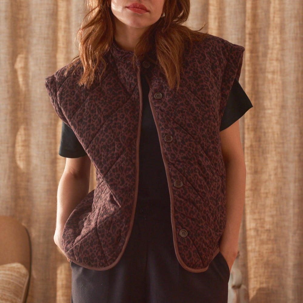 The Charlie chocolate leopard cardigan is a statement piece that combines style and comfort. Crafted from 100% double cotton gauze quilted with wadding, it offers a contemporary and cozy look, perfect for transitional seasons and elegant layering. Its refined yet bold chocolate leopard print adds a distinctive, fashionable touch while remaining easy to pair with black, brown, or denim basics. With its slightly oversized cut and structured quilting, this vest is a statement piece, ideal for a chic yet casual look. Straight cut, slightly oversized