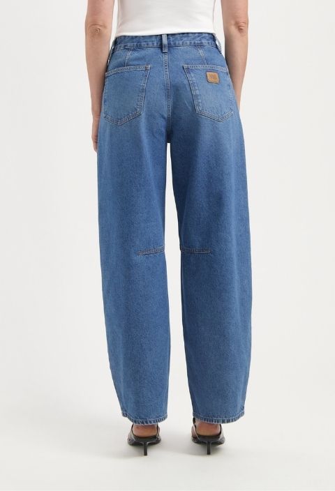 The Demi is in a High Balloon design that features a high-rise waist for a bold, sculpted silhouette. The medium aged wash adds a classic, worn-in feel. Made from 11.5 oz non-stretch denim with 77% recycled and organic cotton, 21% lyocell, and 2% other recycled fibres – 57% of the fabric is recycled.