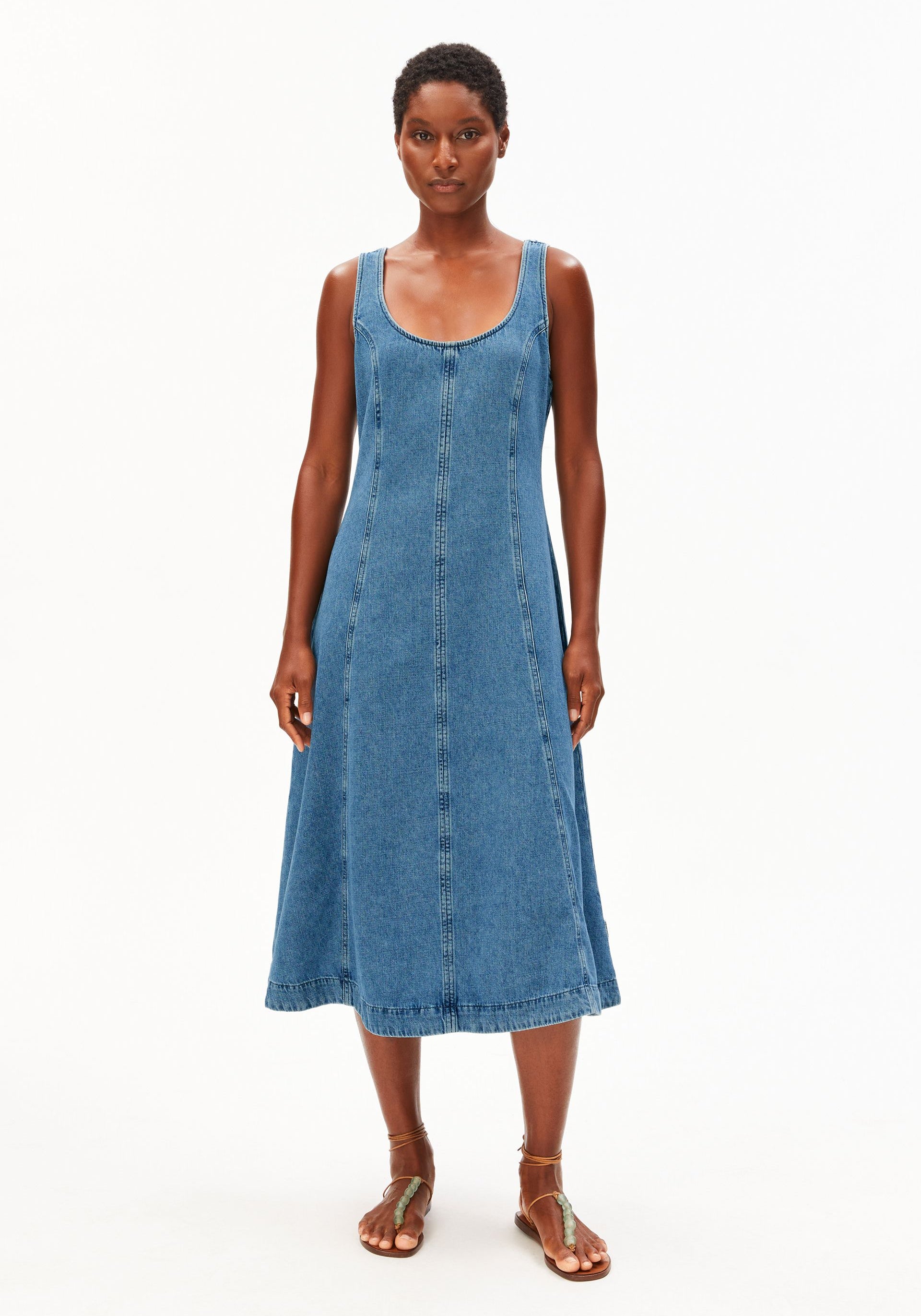 The denim midi dress features a fitted bodice and gently flares out from the waist. A deep neckline defines the silhouette. The denim, made from organic cotton and TENCEL™ Lyocell, feels comfortable while maintaining a clean shape.