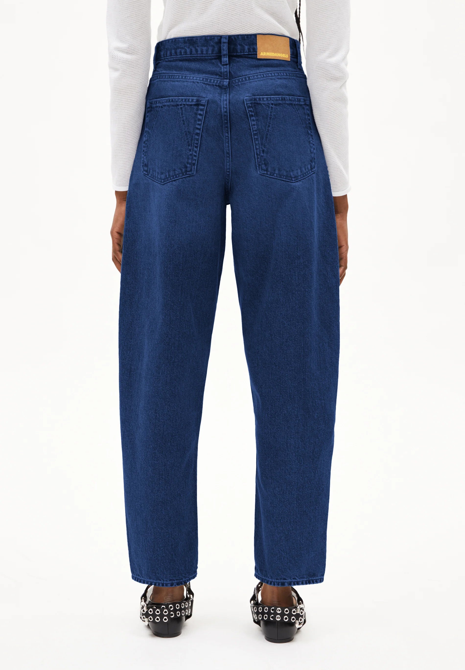 O so cool barrel leg high waist jeans made of 100% recycled cotton. Crafted from heavy, firm denim without stretch and finished with a button placket.