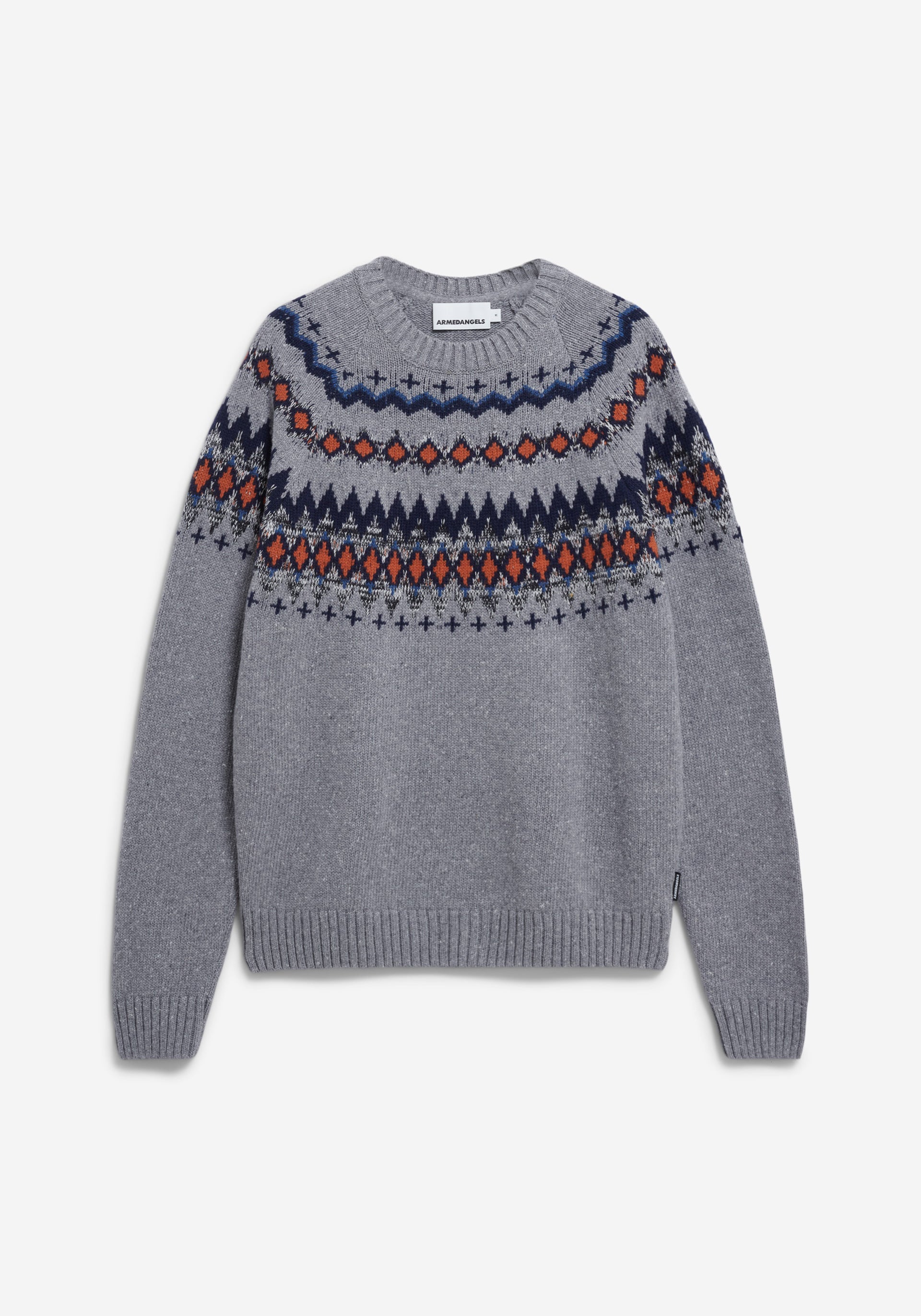 The KAALLA FAIR ISLE sweater features a straight cut and a bold chunky knit pattern in classic Fair Isle style. The striking graphic pattern recalls traditional Nordic motifs. The blend of organic cotton and wool provides a soft and warming feel.