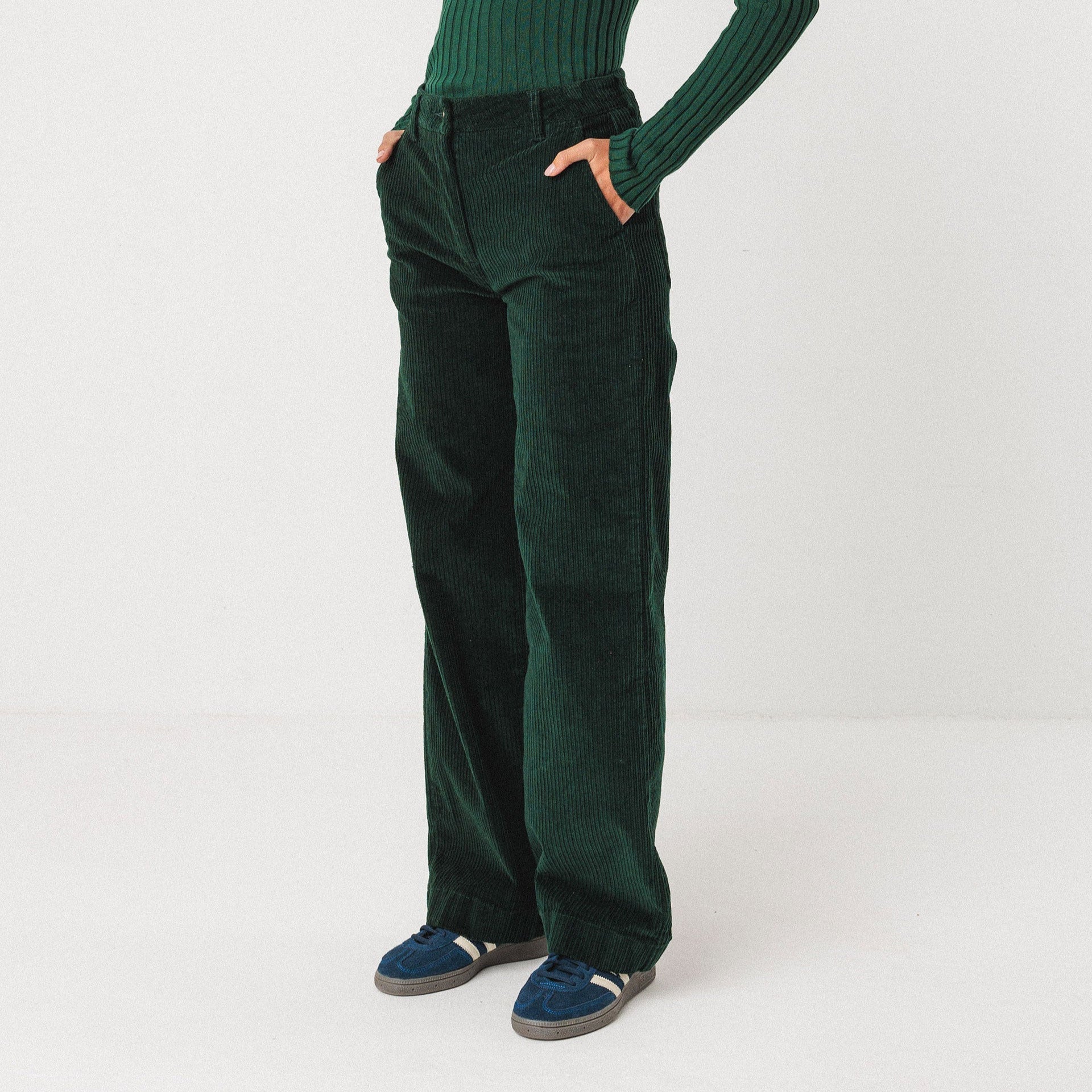 Straight leg, ankle length corduroy trousers in GOTS certified organic cotton. They have slant pockets and a zip fly at the front and patch pockets at the back.