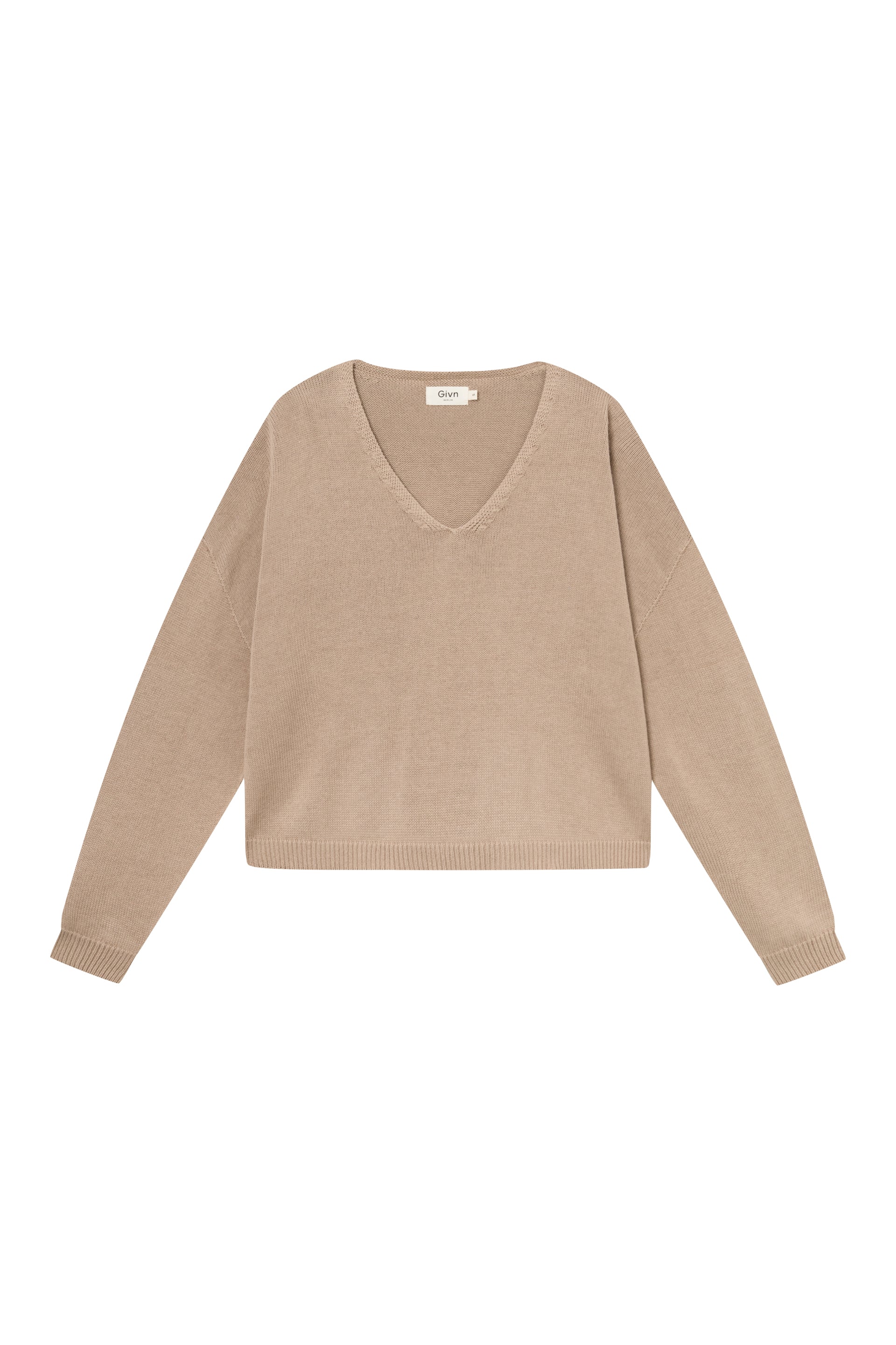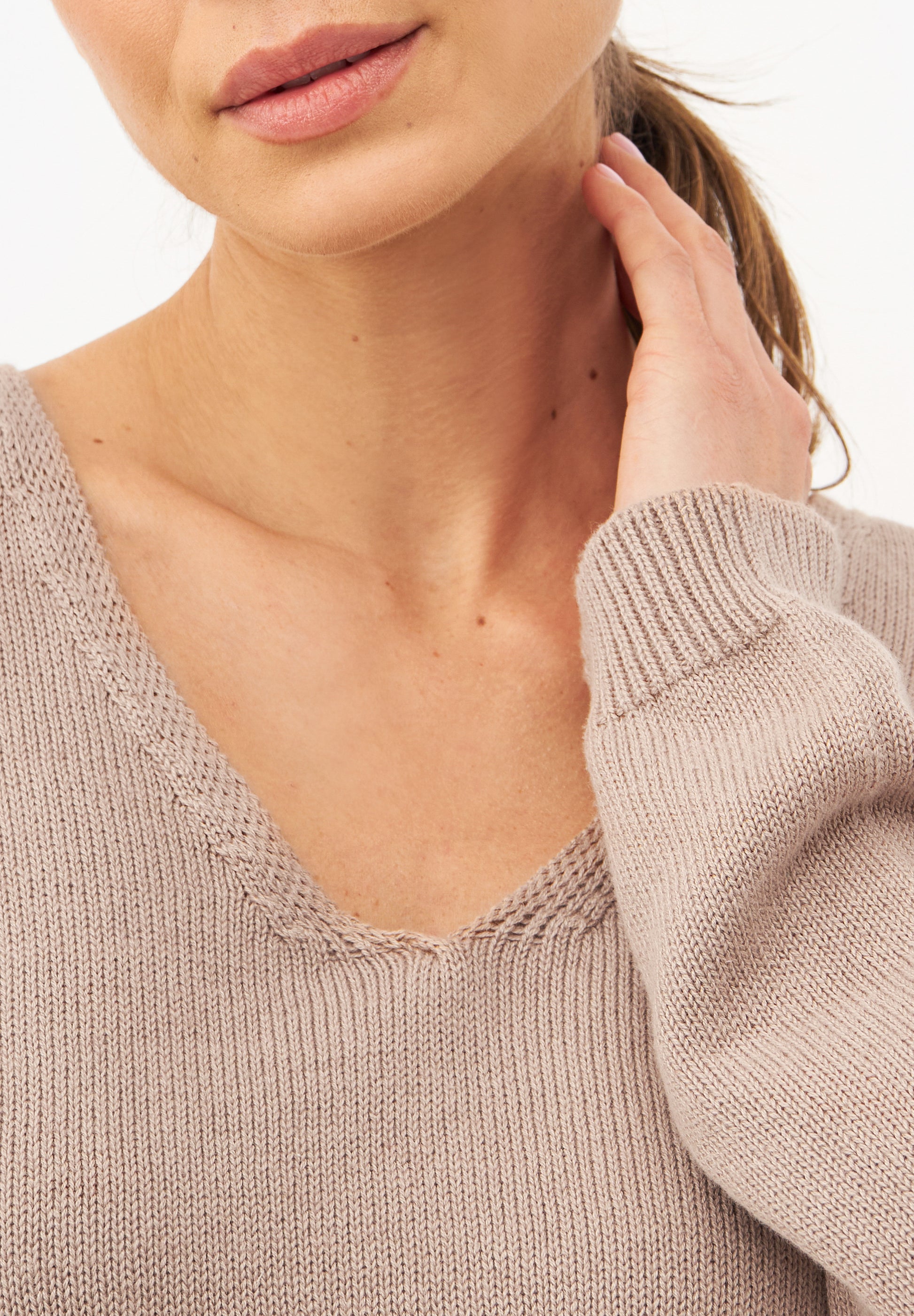 Summer jumper of our dreams: the shade of the beach, a mix of cotton and linen, and a flattering, slightly oversized fit with a V-neckline.