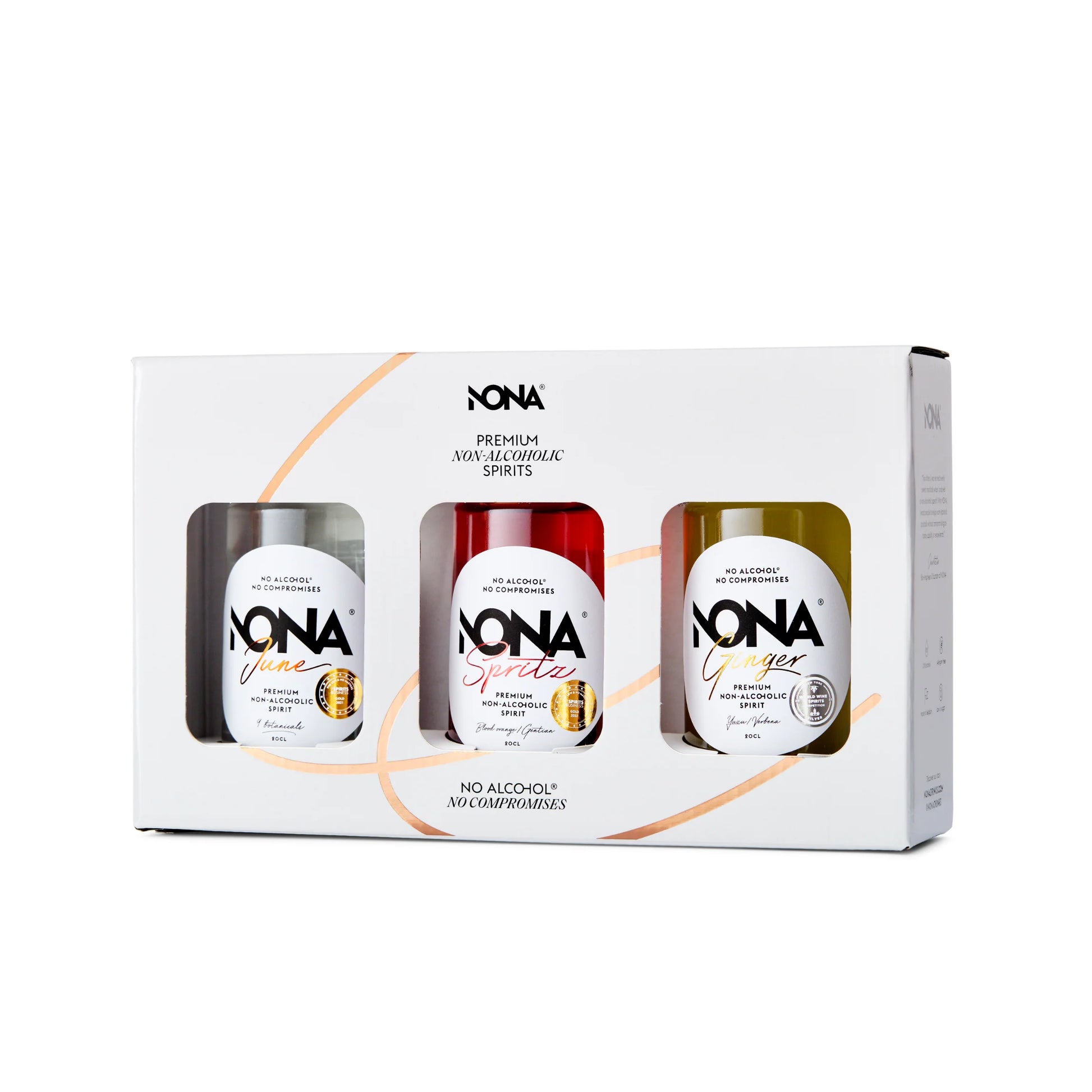Discover the different non-alcoholic NONA spirits with our brand new NONA tasting pack. With this benefit bundle, taste NONA June, NONA Spritz and NONA Ginger, each in a 20cl bottle. Get inspired by our included recipe booklet packed with surprising non-alcoholic cocktails.