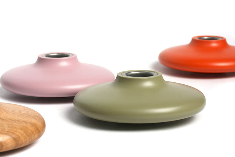 Round and flat like a stone. The Flitsh candlestick, made of oiled oak, is produced in Germany. Standard household candles with a diameter of 22mm fit into the brass candle shell.