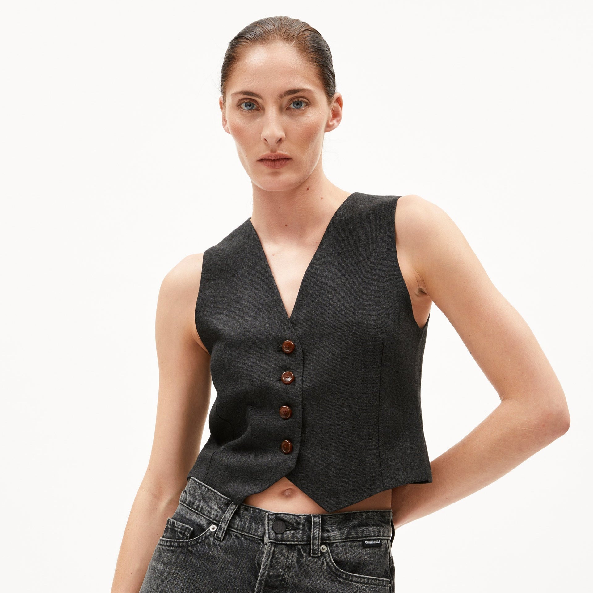 The SINERIAA PREMIUM MEL vest, made from soft twill, offers a body-hugging fit with a short cut and V-neckline. The button placket complements the classic look, while the fabric made from 100% TENCEL™ Lyocell ensures soft wearing comfort.