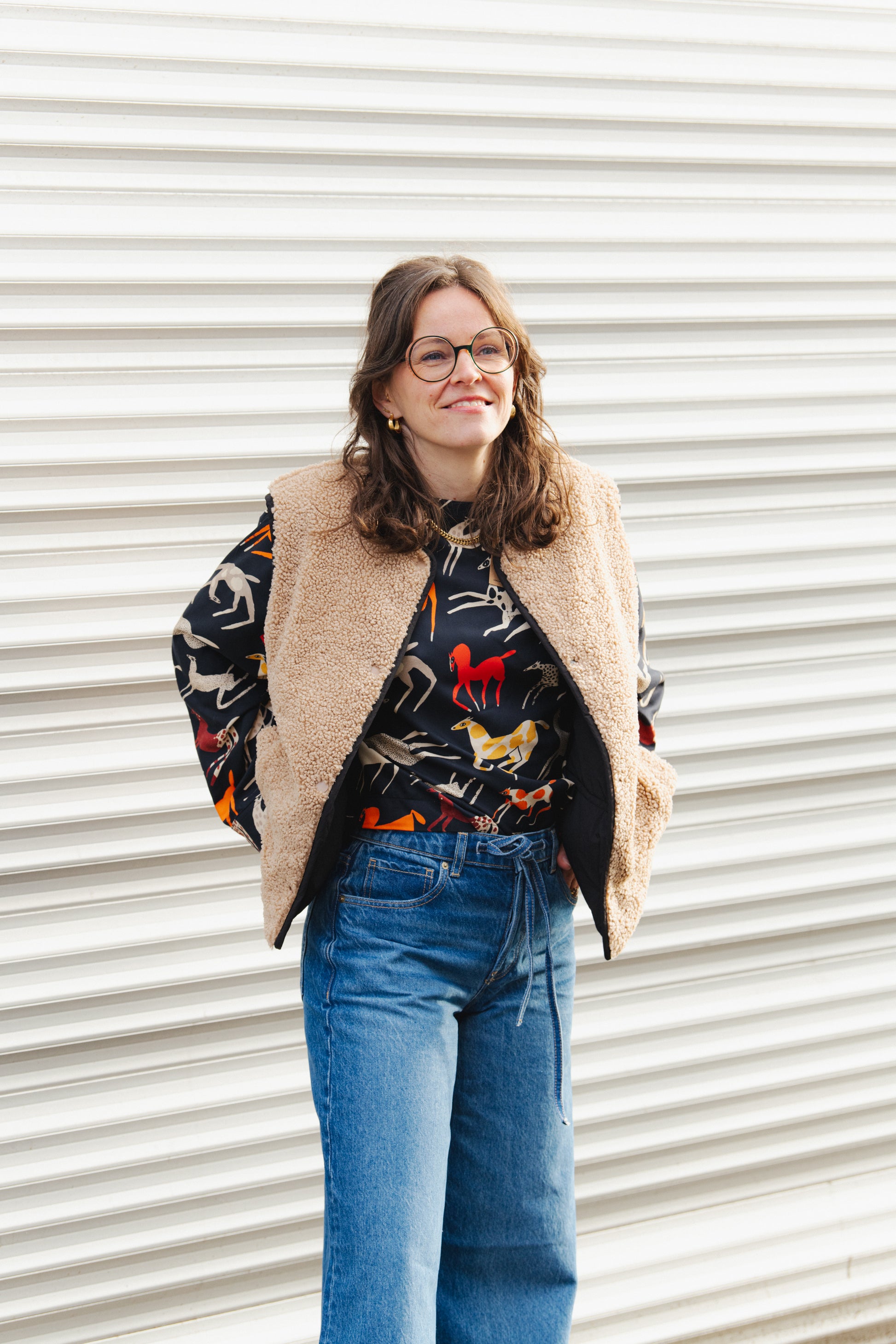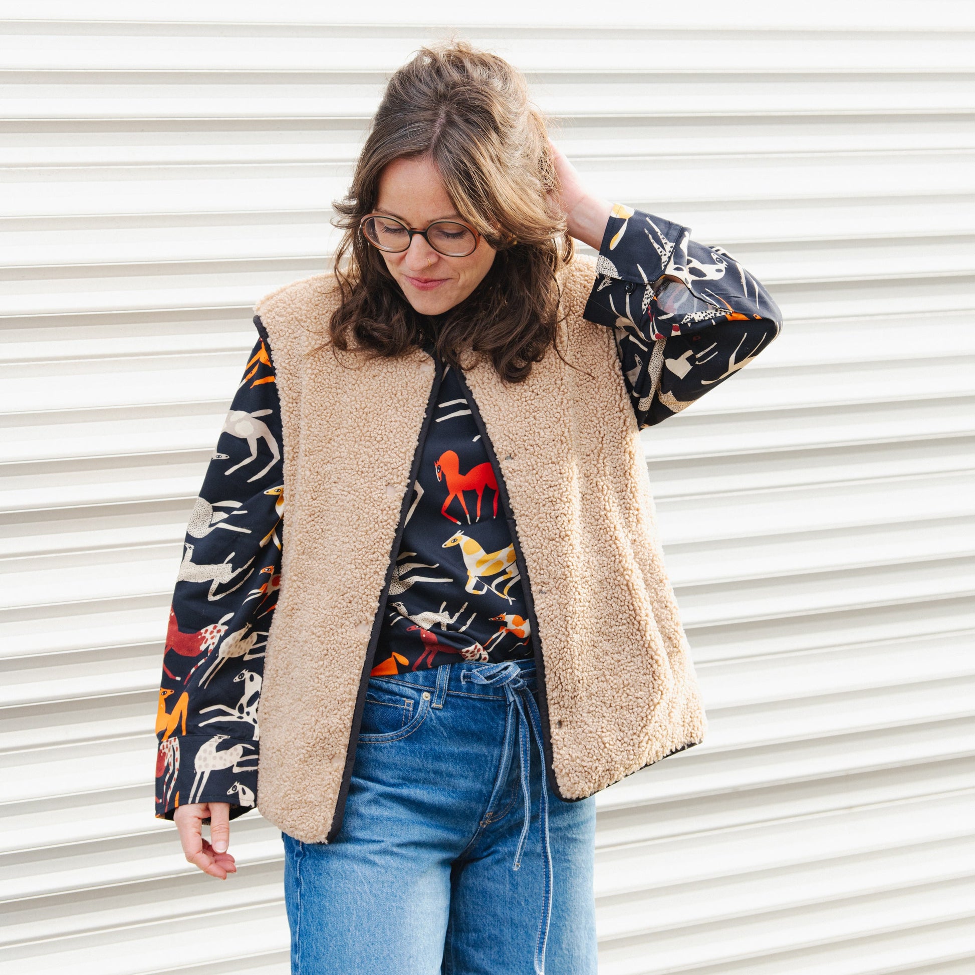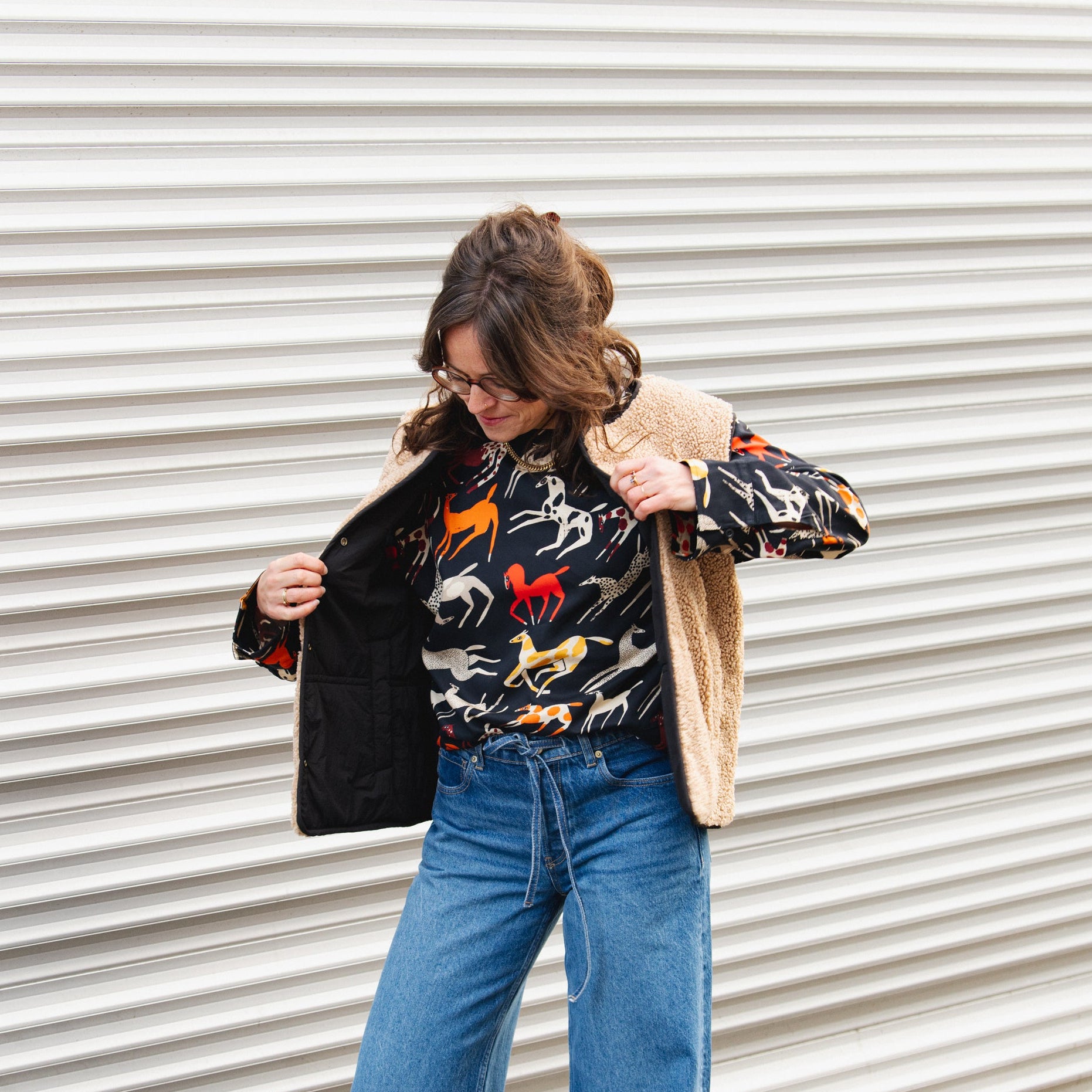 Wide fit top with boat neckline, wide sleeves and wide cuffs with a single corozo button.