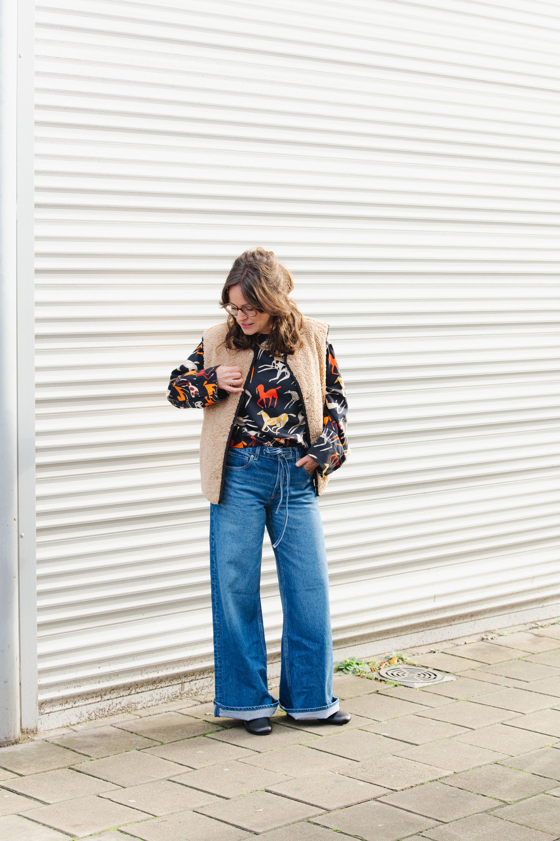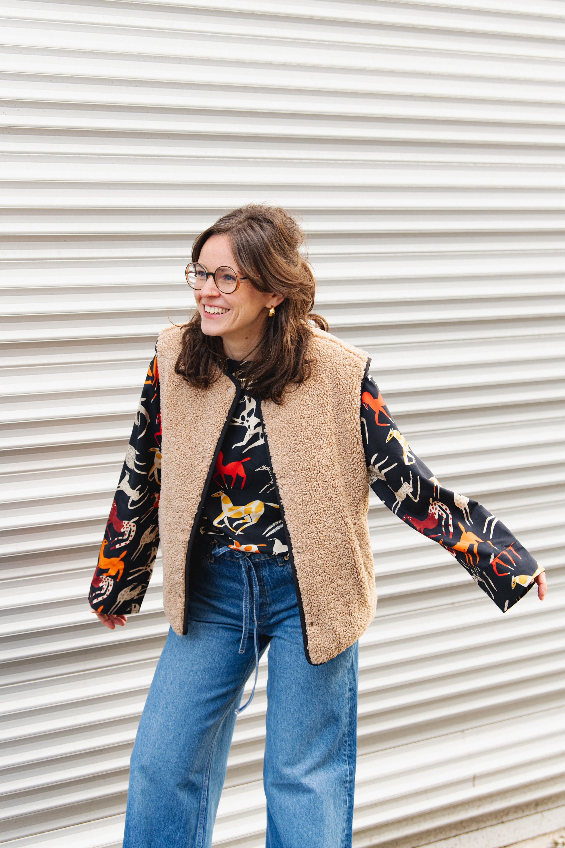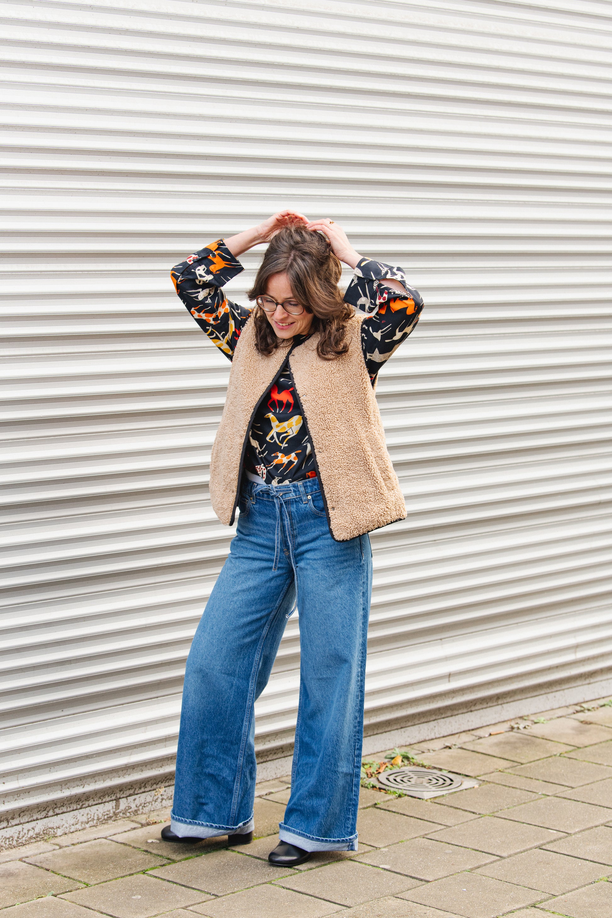 Wide fit top with boat neckline, wide sleeves and wide cuffs with a single corozo button.